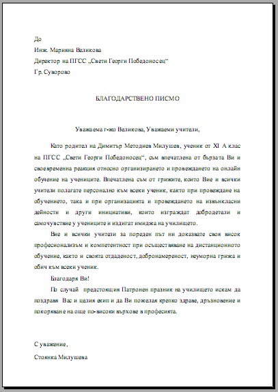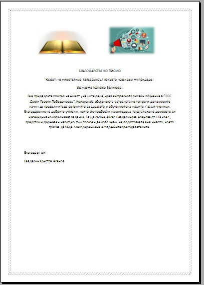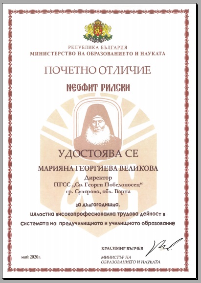 03.11.2020 г. Инж. Марияна Великова, директор на ПГСС „Св. Георги Победоносец” в гр. Суворово е отличена от Областна администрация Варна с ГРАМОТА БЛАГОДАРНОСТ за значим принос в провеждането на държавната политика в областта на средното образование.