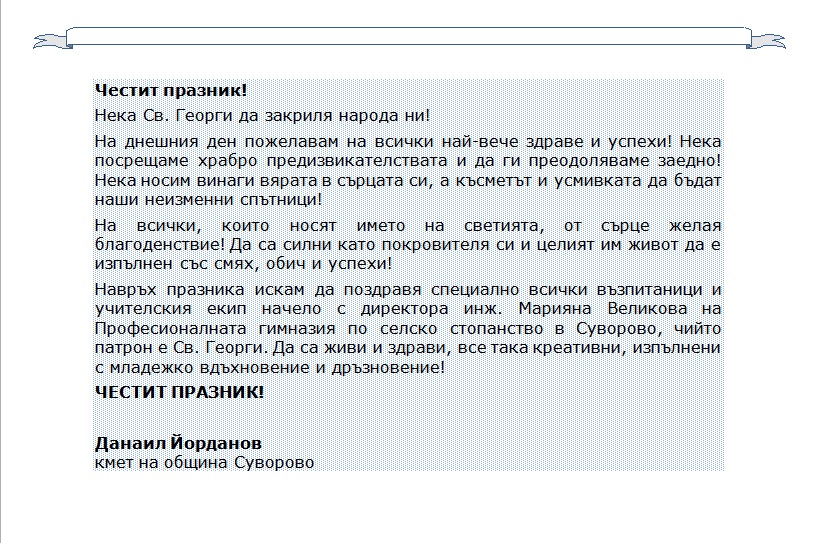 Честит празник на ПГСС от Данаил Йорданов - кмет на община Суворово.