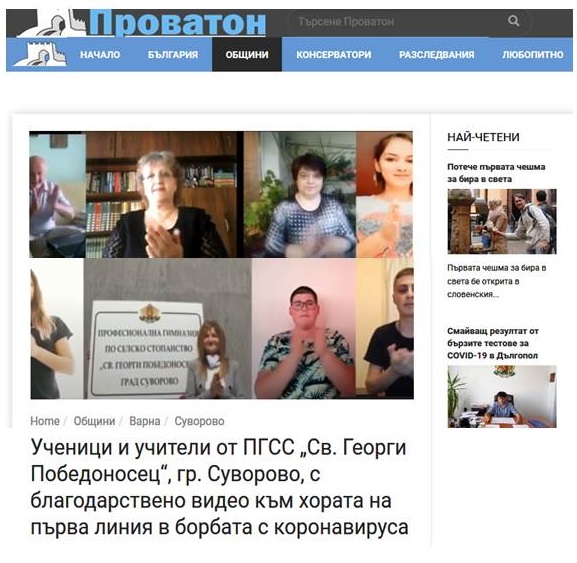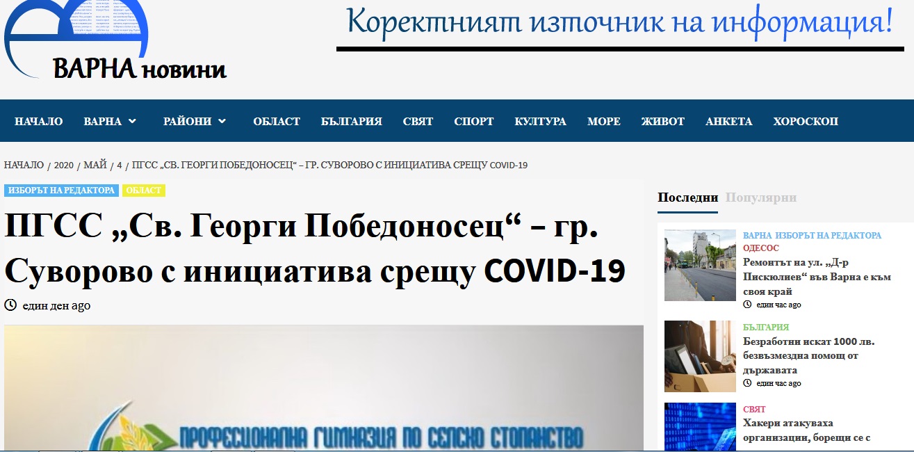 ВАРНА новини: ПГСС „Св. Георги Победоносец“ – гр. Суворово с инициатива срещу COVID-19