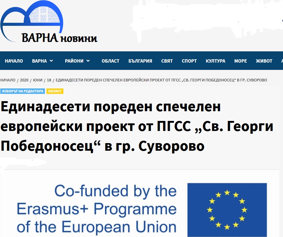 ВАРНА новини: "Единадесети пореден спечелен европейски проект от ПГСС „Св. Георги Победоносец“ в гр. Суворово"