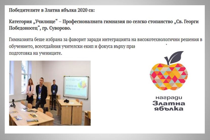 Проватон: "ПГСС “Св. Георги Победоносец” в Суворово с национална награда “Златната ябълка”