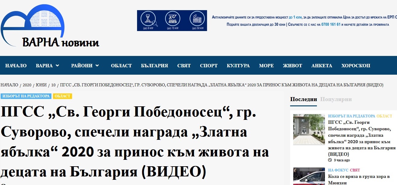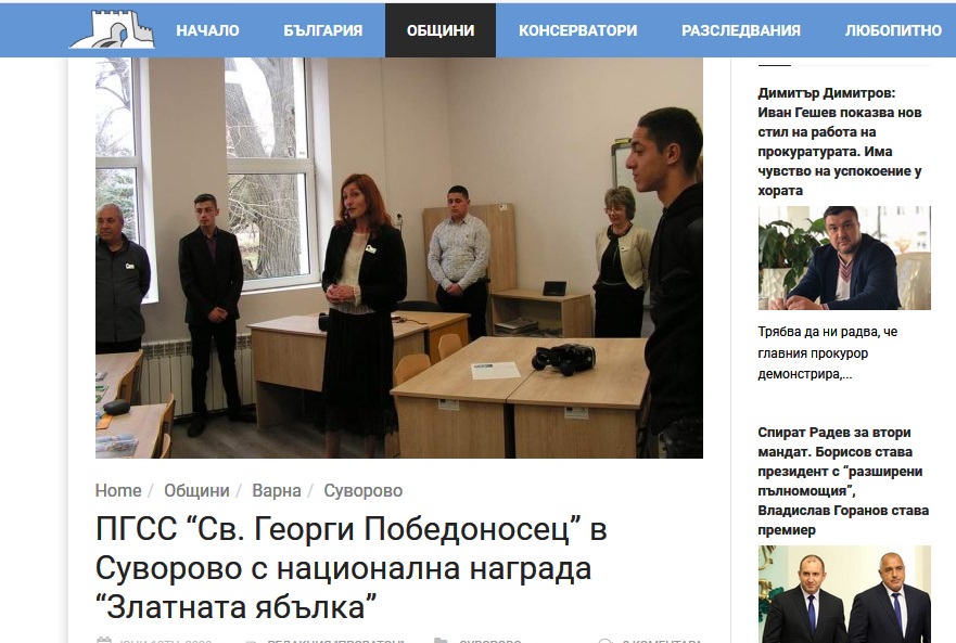 ВАРНА новини: ПГСС „Св. Георги Победоносец“, гр. Суворово с номинация за наградата „Златна ябълка 2020“
