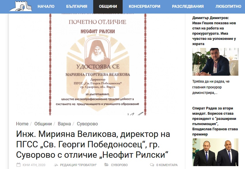 Проватон: "Инж. Мирияна Великова, директор на ПГСС „Св. Георги Победоносец“, гр. Суворово с отличие „Неофит Рилски“
