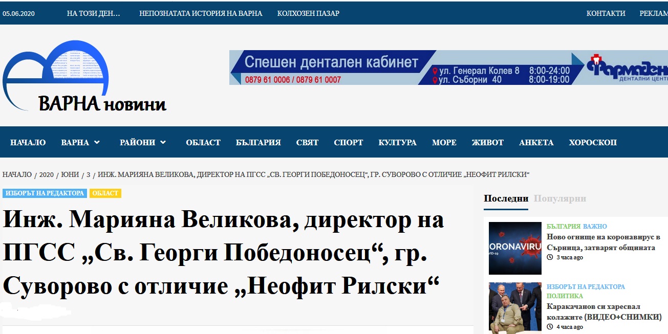 ВАРНА новини: Инж. Марияна Великова, директор на ПГСС „Св. Георги Победоносец“, гр. Суворово с отличие „Неофит Рилски“.