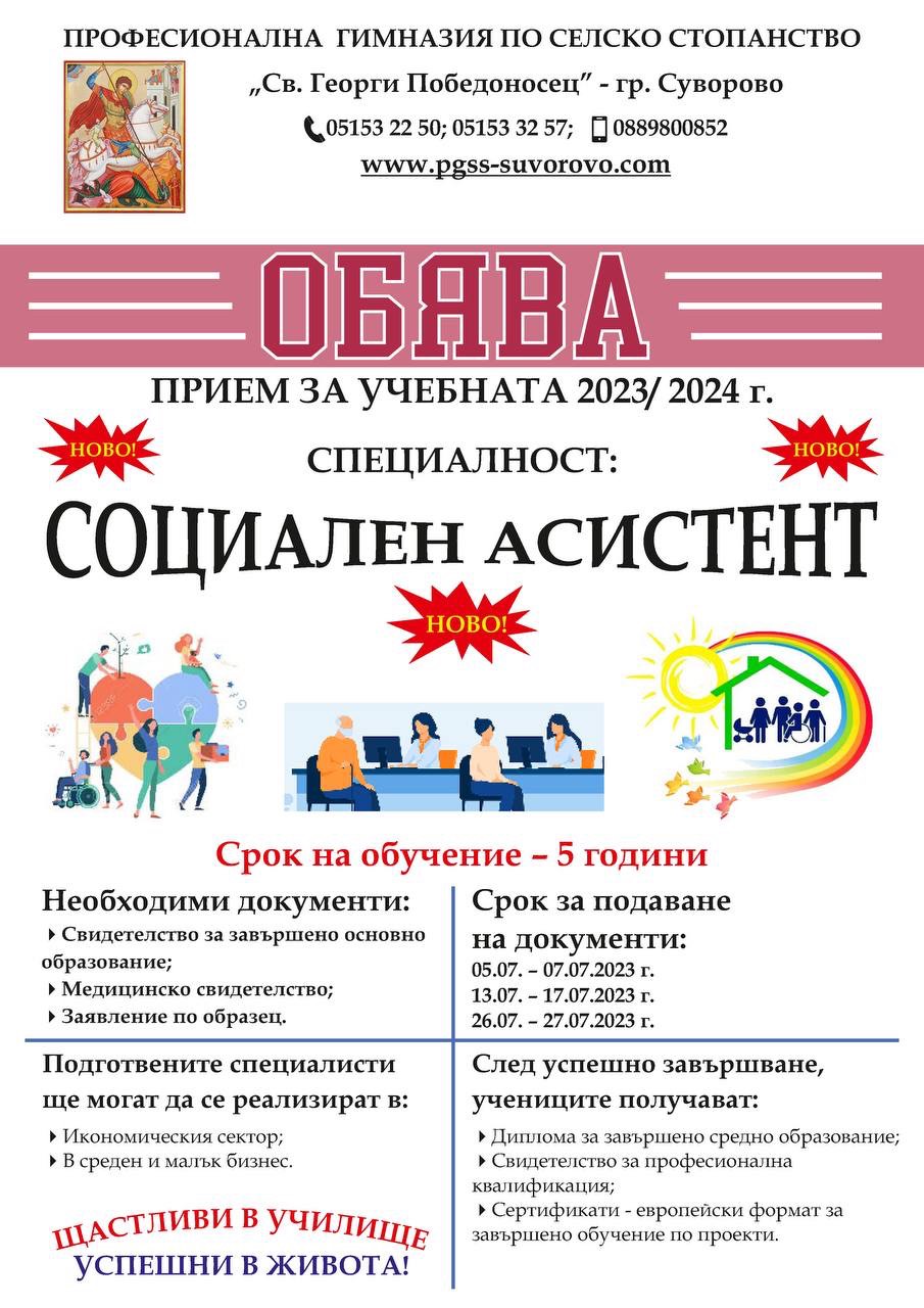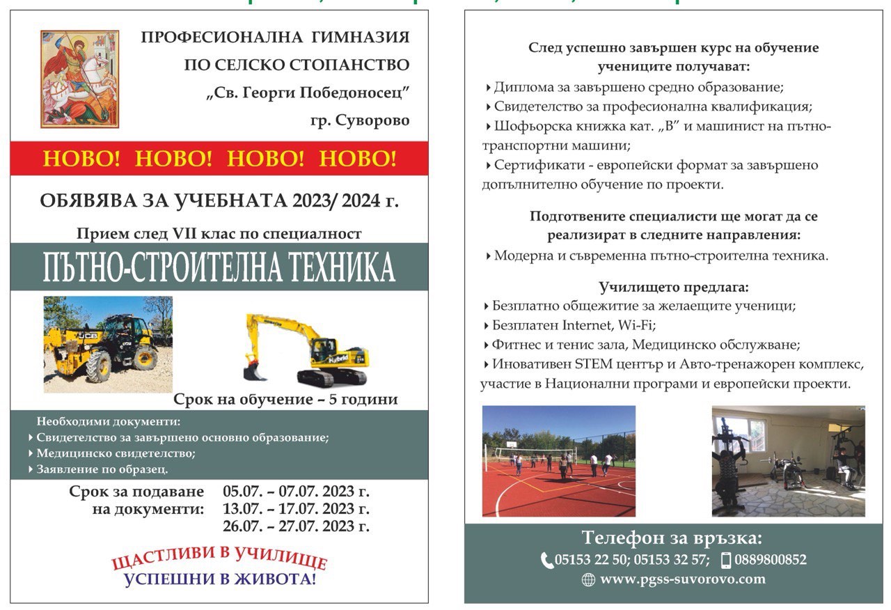 - Възможност да продължат образованието си в ПГСС "Св. Георги Победоносец" гр. Суворово;